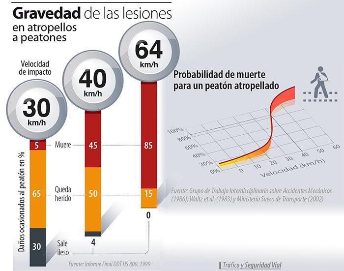 - A partir de 80 km/h es prácticamente imposible que un peatón se salve de un atropello, mientras que a una velocidad de 30 km/h, el riesgo de muerte del peatón se reduce al 5%.
